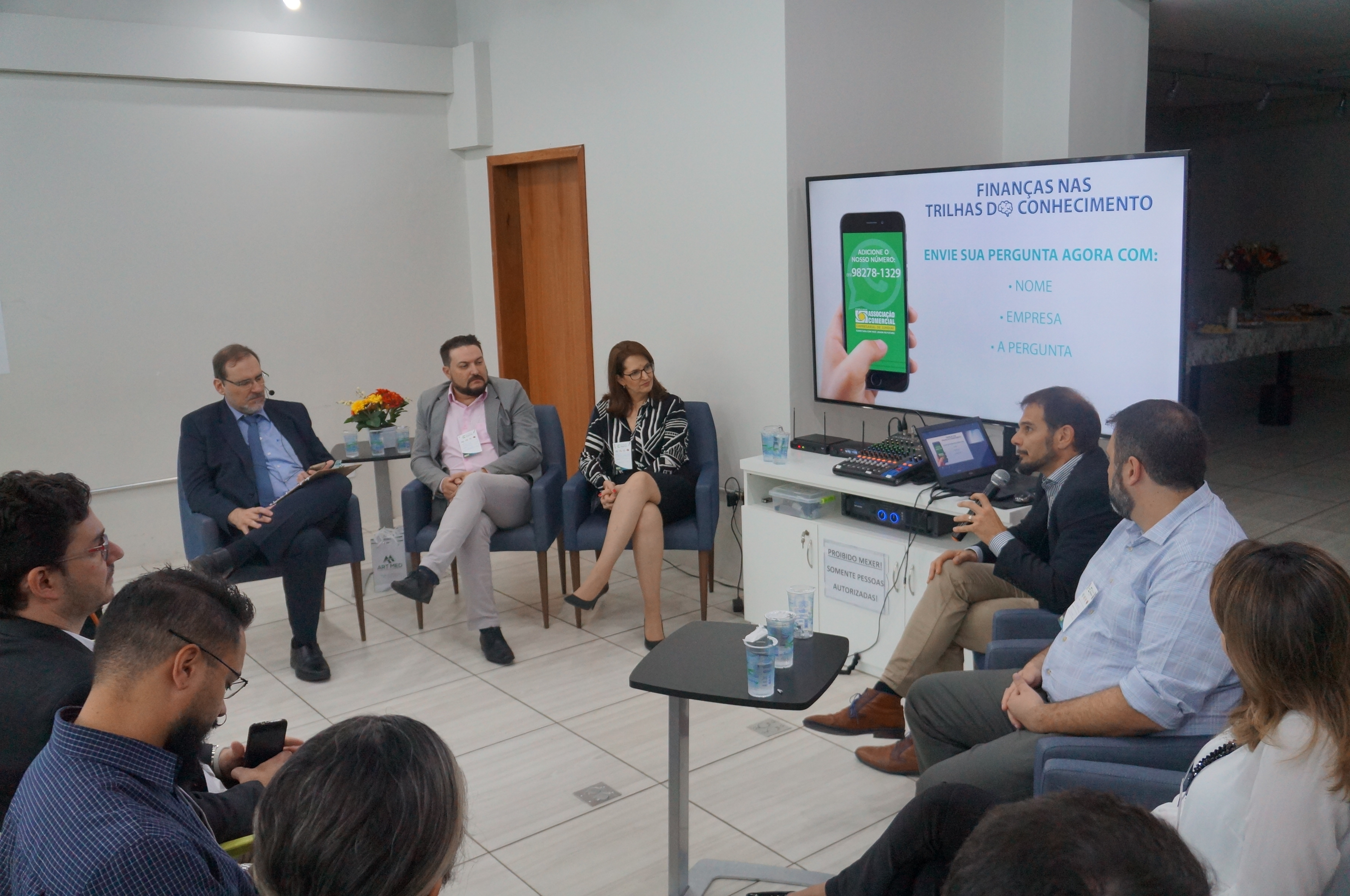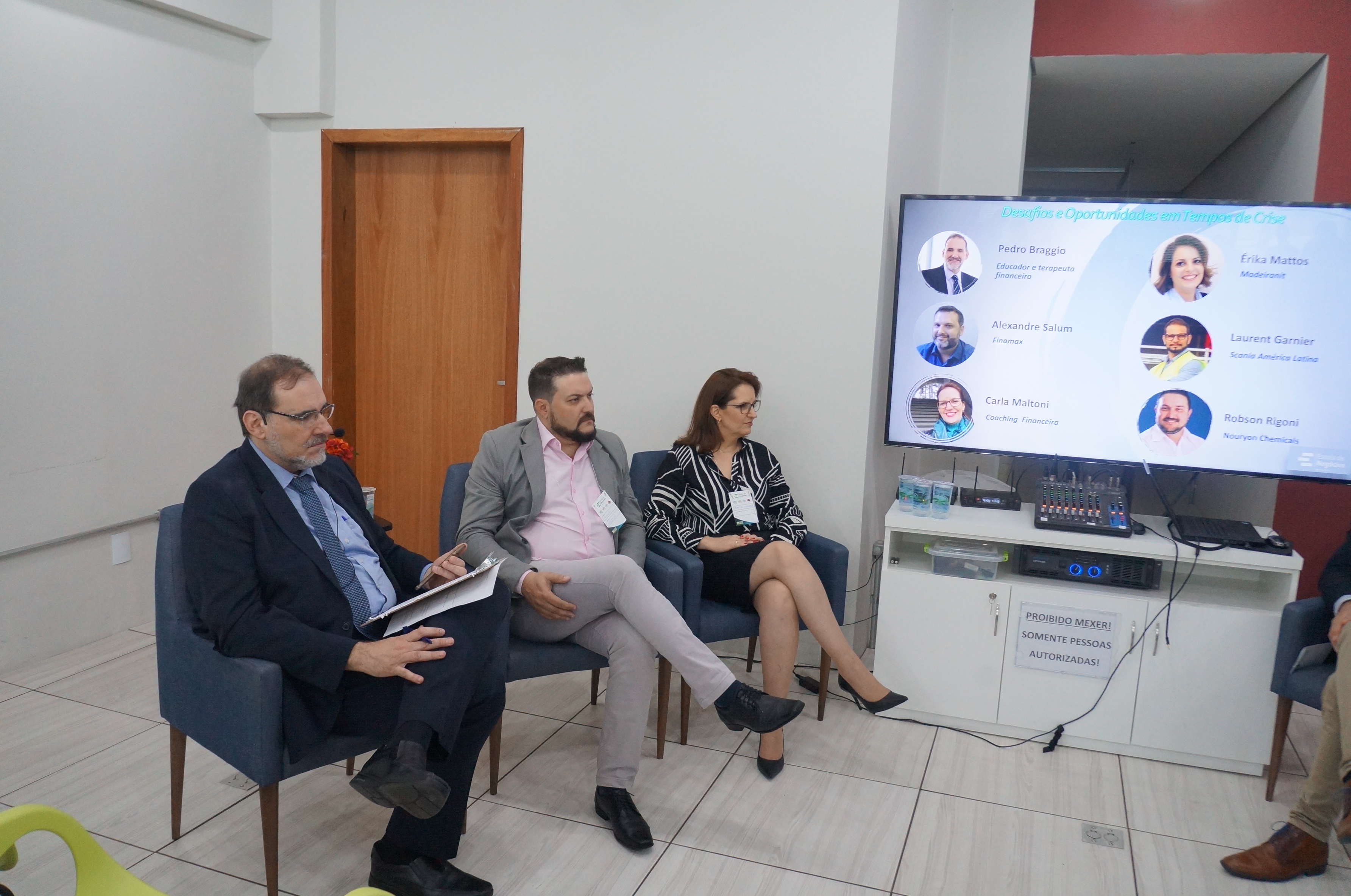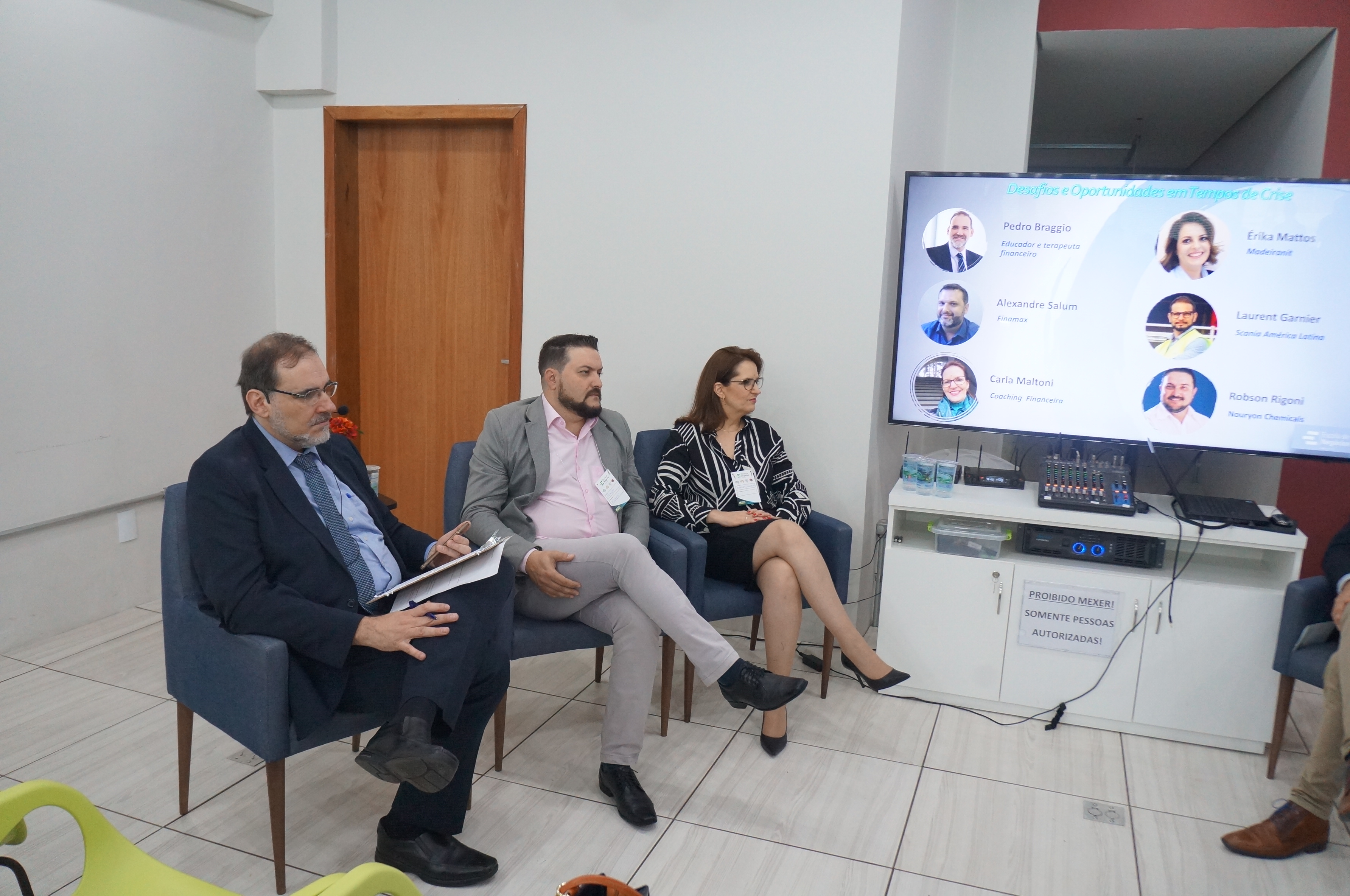 O educador e terapeuta financeiro Pedro Braggio fez a mediação e os profissionais Alexandre Salum (Gerente de Planejamento de Crédito na Finamax), Carla Maltoni (empresária e coach de Inteligência Financeira), Érika Mattos (gerente regional da Madeiranit), Laurent Garnier (diretor de operações logísticas na Scania América Latina) e Robson Rigoni (gestor na Nouryon Chemical) compartilharam experiências em suas áreas, respondendo a perguntas do mediador e do público.